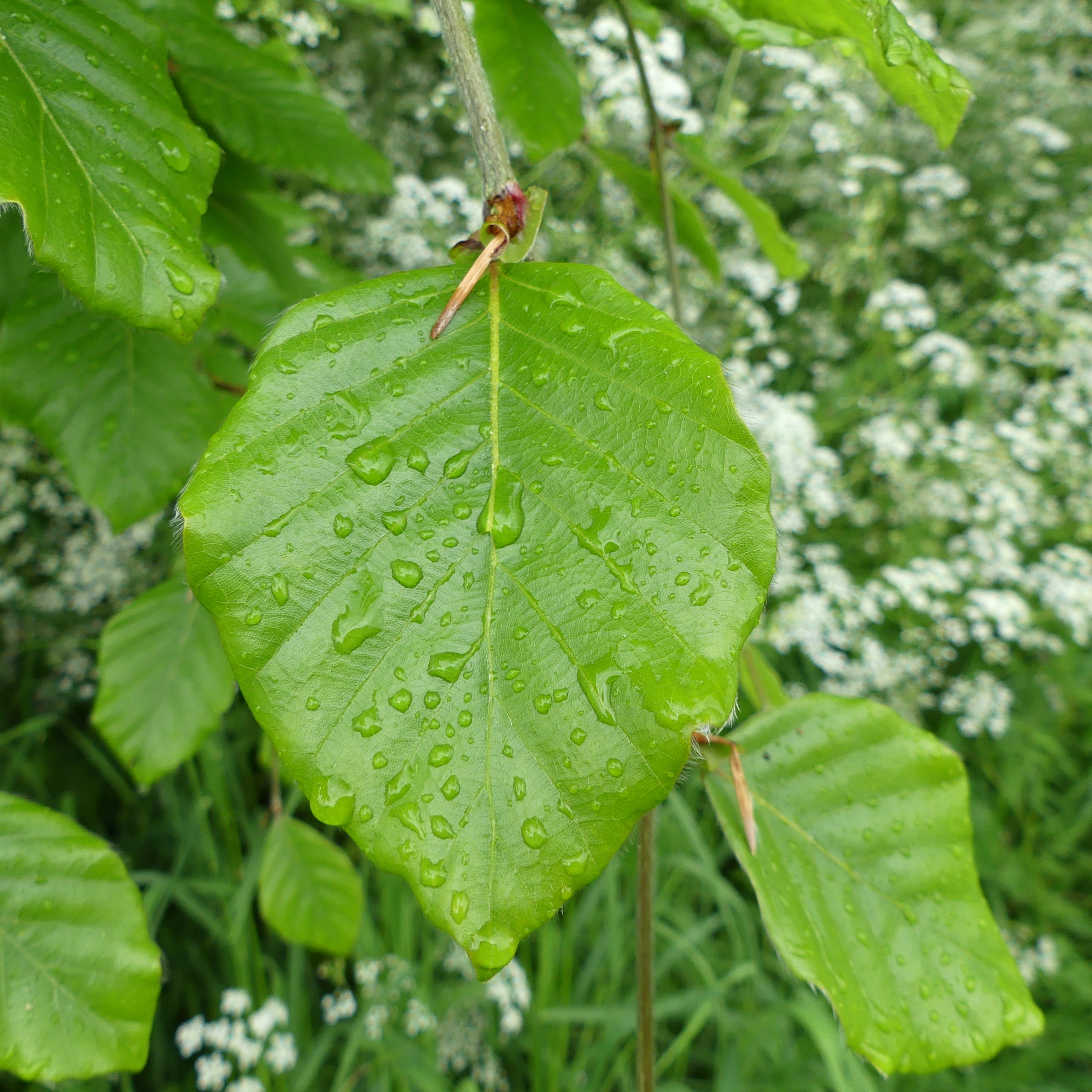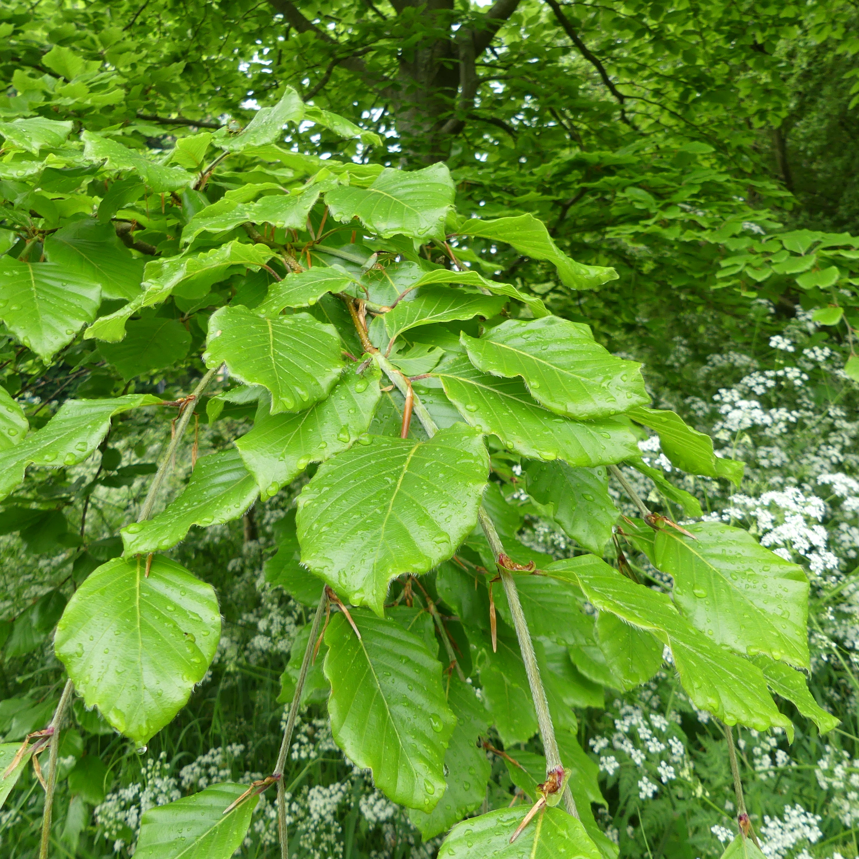 There is only one true Beech tree (Fagus sylvatica) in Charlton Down Nature Area. It is found close to the pond, behind the old carved wooden seat. It was planted maybe about 15 years ago. Now in mid-May the fresh lime green leaves are fully opened. When the leaves first come out of the buds, they are folded up like a fan that gradually opens, and the translucent blade is fringed with fine hairs.