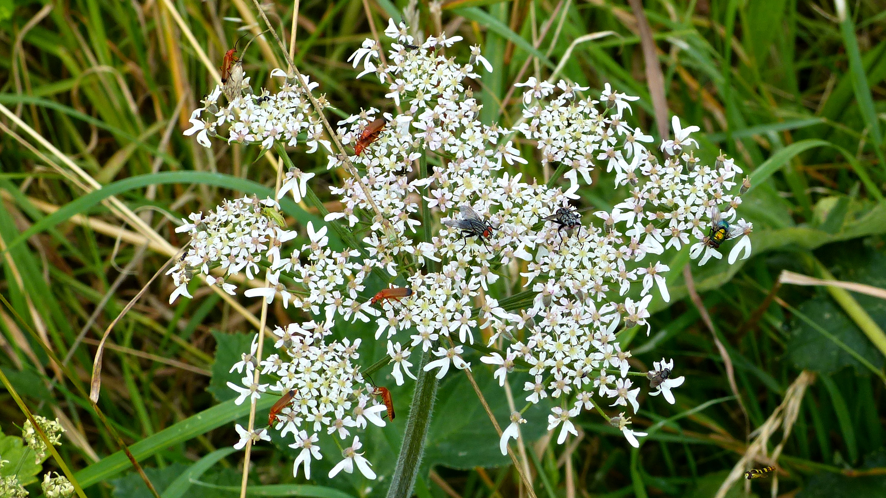 Common Red Soldier Beetles (Rhagonycha fulva) are a common sight in late spring or early summer in the Charlton Down Nature Area where they are most noticeable on the white flowers of native hogweed plants. The elongate and soft-winged adults with their long and slender antennae are often seen in mating pairs. Their larvae are carnivorous and feed on arthropods.