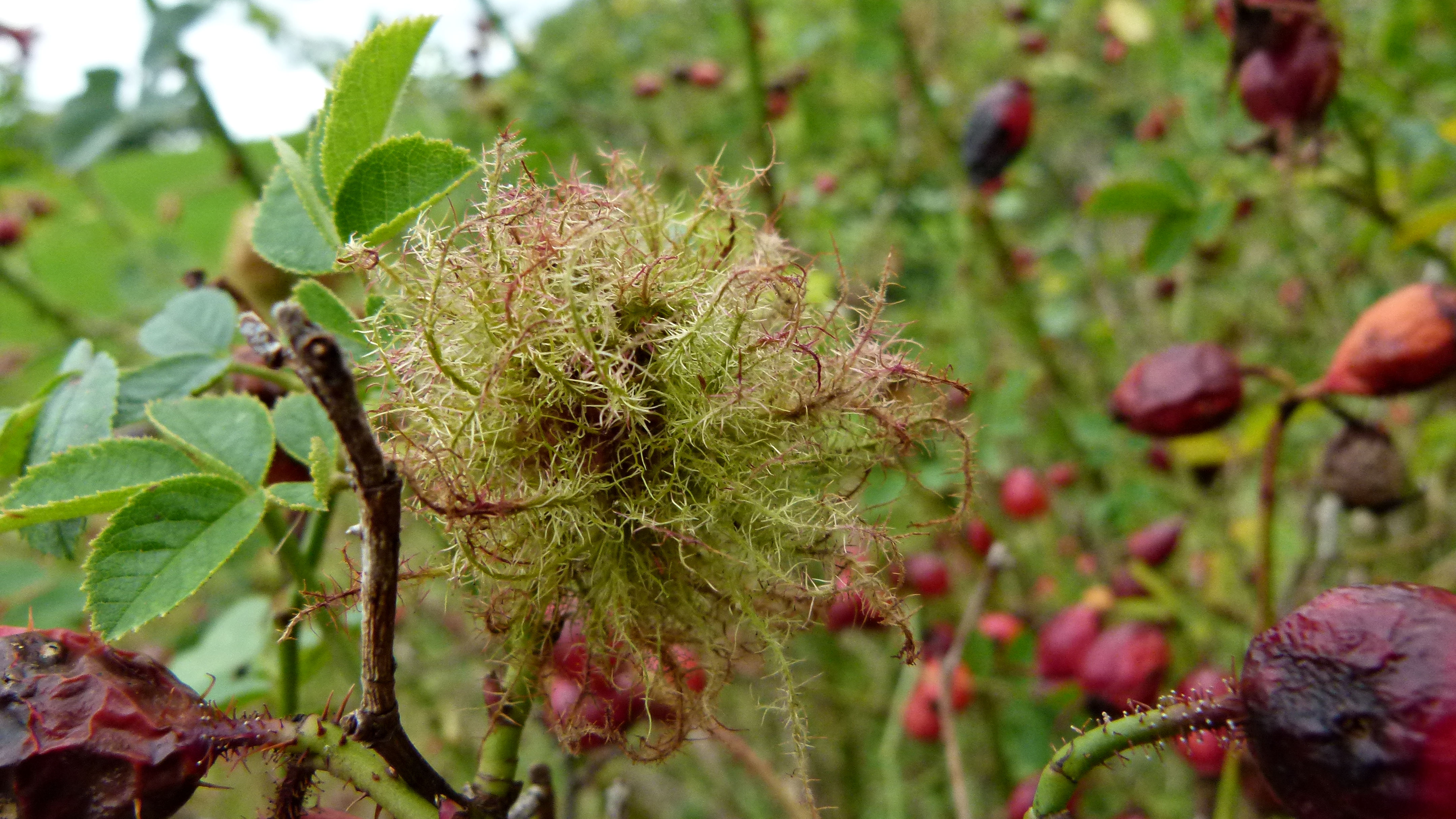 The Robin’s Pin Cushion (also known as a Bedeguar gall) must be one of the most attractive galls on British plants. In this case the gall has resulted from a very small wasp (Diplolepis rosae) laying its eggs in a wild rose flower bud. It is one 15 types of gall created by different organisms that have been found in Charlton Down Nature Area in Dorset to date.