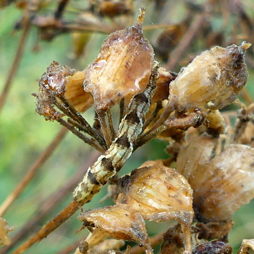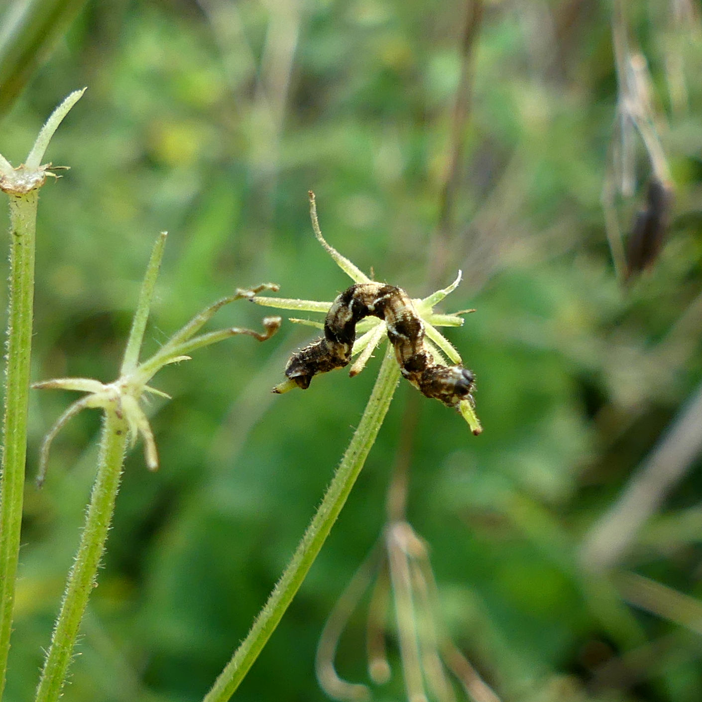 Pug Moth caterpillars (Epithecia sp.) These tiny caterpillars are masters of disguise. The specimens in these images were all feeding on the seeds of common hogweed but it is difficult to say which particular species of the 56 different species of pug moth they are (but they may be White-spotted Pug based on the food plant). They have a looping habit of locomotion and their variable markings camouflage them well on their chosen food plant. One of the 38 species of Lepidoptera found in the Charlton Down Nature Area to date.