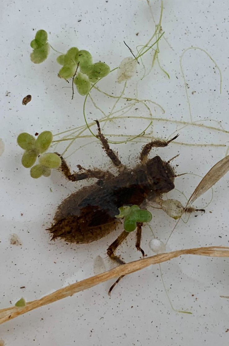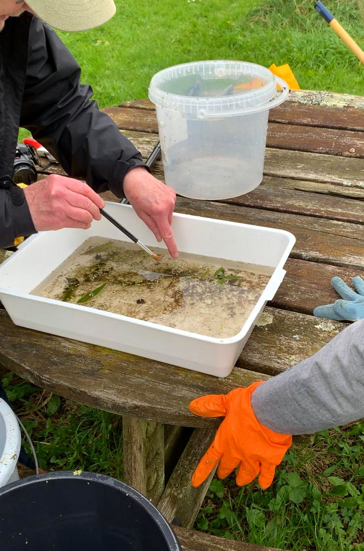 We used a pond net to scoop up the submerged plants and tipped the bag contents into buckets for transfer to their new home. We were totally amazed at the number of creatures that were living in the vegetation We knew they were there but not how many and what types. There were diving beetles, dragonfly nymphs, great water boatmen, water hog lice, and surprisingly, freshwater shrimps which were probably introduced with the river water that was used to fill the pond.