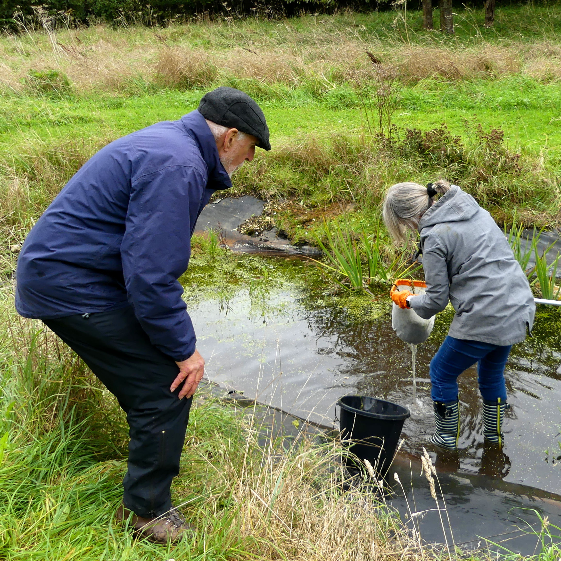 Yesterday in the Nature Area we started the process of converting the smaller part of the pond lying to the north of the footbridge into a Bog Habitat. The first stage is to carefully remove all the aquatic plants (mostly Starwort) and invertebrates that have colonised the shallow water since February this year and transfer them to the larger main pond before partially infilling the hollow with soil and replanting with species that like waterlogged ground.