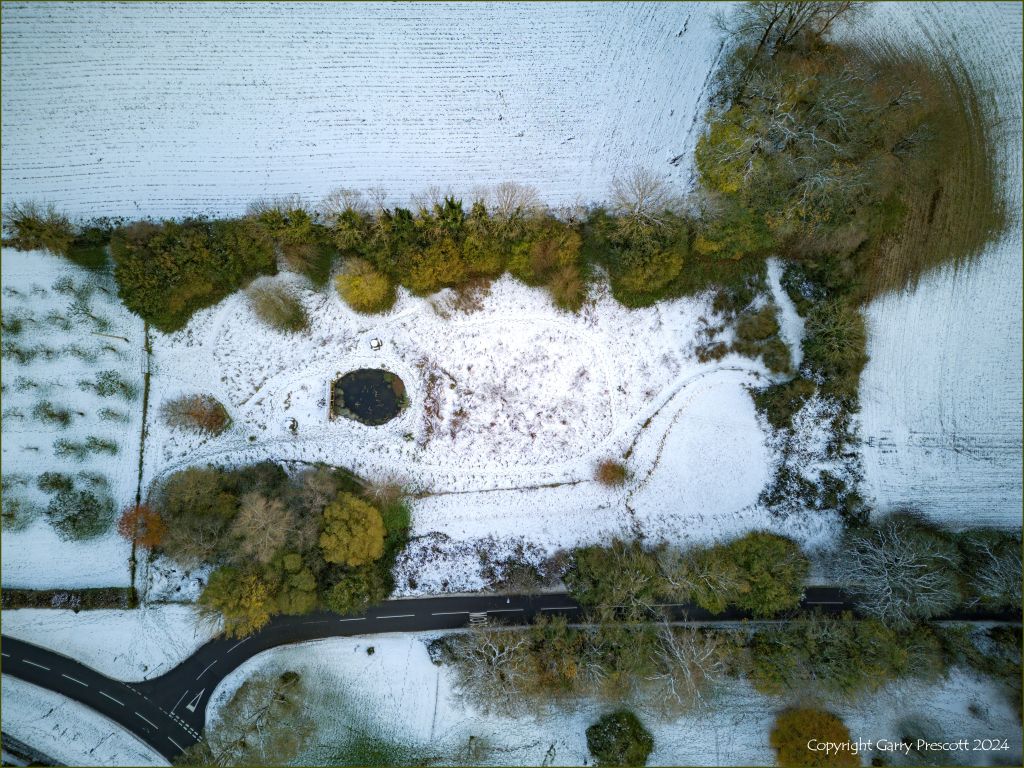 It doesn’t snow very often in Dorset, England. So I was delighted when Garry Prescott, one of our volunteers, was able to take these drone photographs showing the few inches of snow that fell on the Charlton Down Nature Area and Community Orchard over a couple of days back in November 2024. I think it looks beautiful and very suitable to display at Christmas time. It was cold enough for our new pond to freeze right over for the first time.
