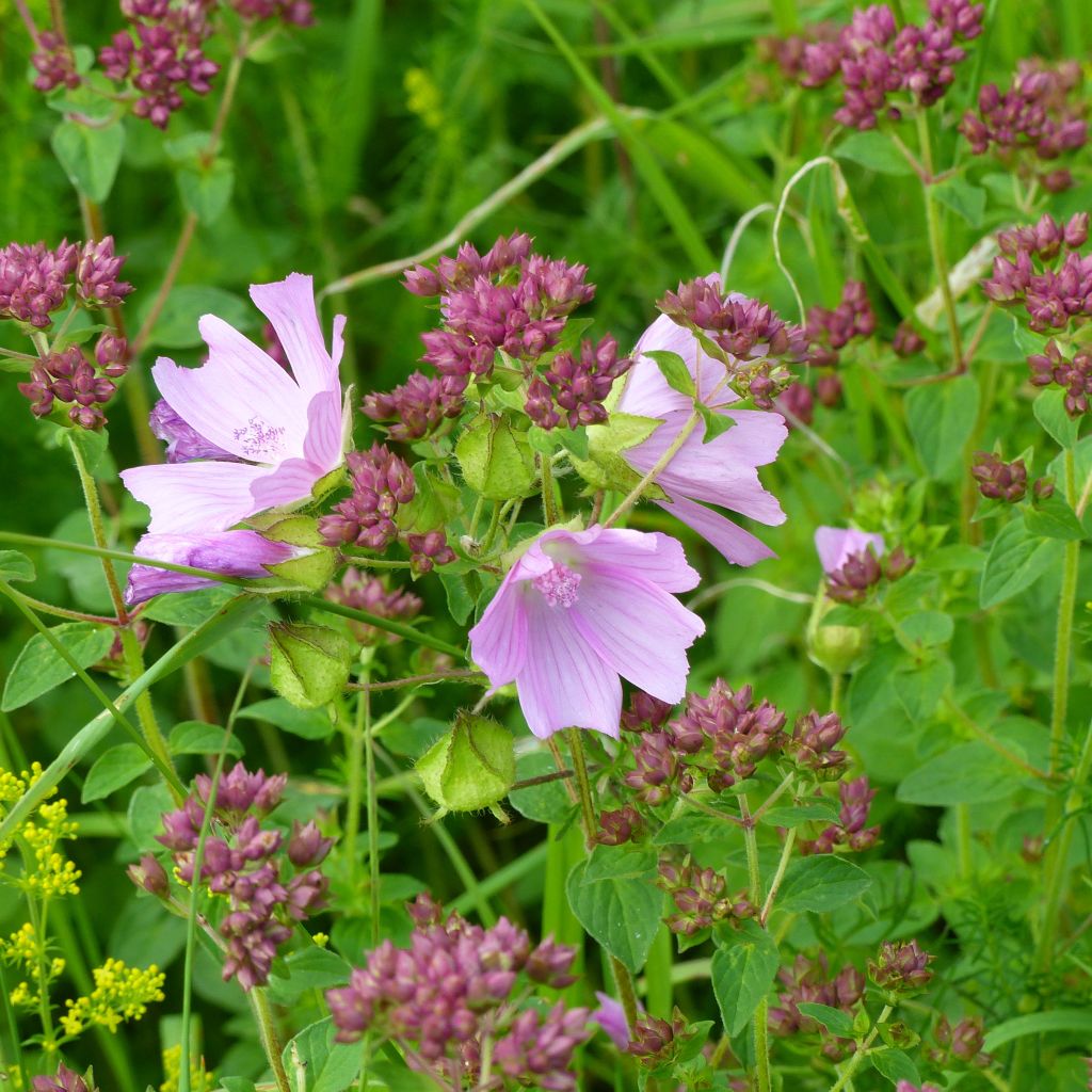 Image Miscellany 10 – A quartet of wildlife images from Charlton Down Nature Area in Dorset showing some of the wide variety of flora and fauna recorded there (pink mallow flowers, reddish-purple betony flowers, hazel nuts, and silk spangle cushion galls on an oak leaf).
