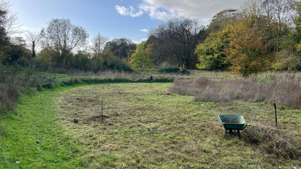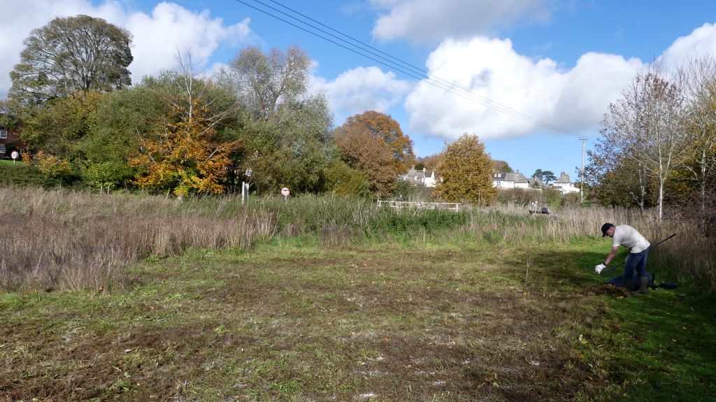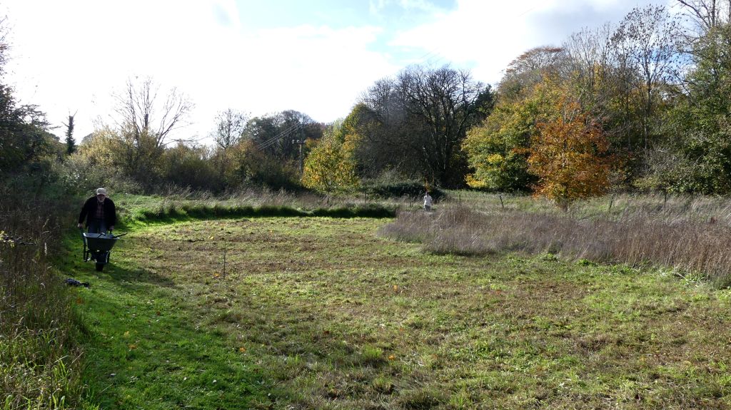 We had no idea what hard work it would be to follow on from the scything activity of 21st October. On the scything day, the cut dried vegetation had been raked up into rows across the portion of the wildflower zone that had been cut down. These arisings had been left for a week to allow small creatures to relocate to safer areas if they could.