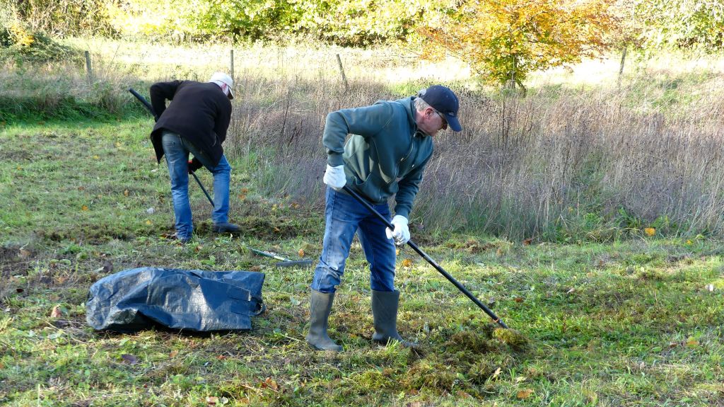 Once the loose material had been removed, we started to scarify the ground to clear some barer areas to accept the new seeds. We found that there were many moss-covered patches between the plants that could be raked up and removed, all the while being careful not to disturb the wasp nest which we had painfully discovered during the scything.