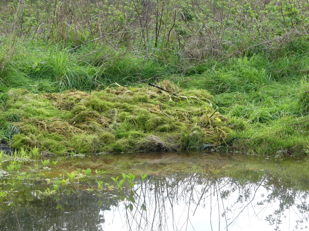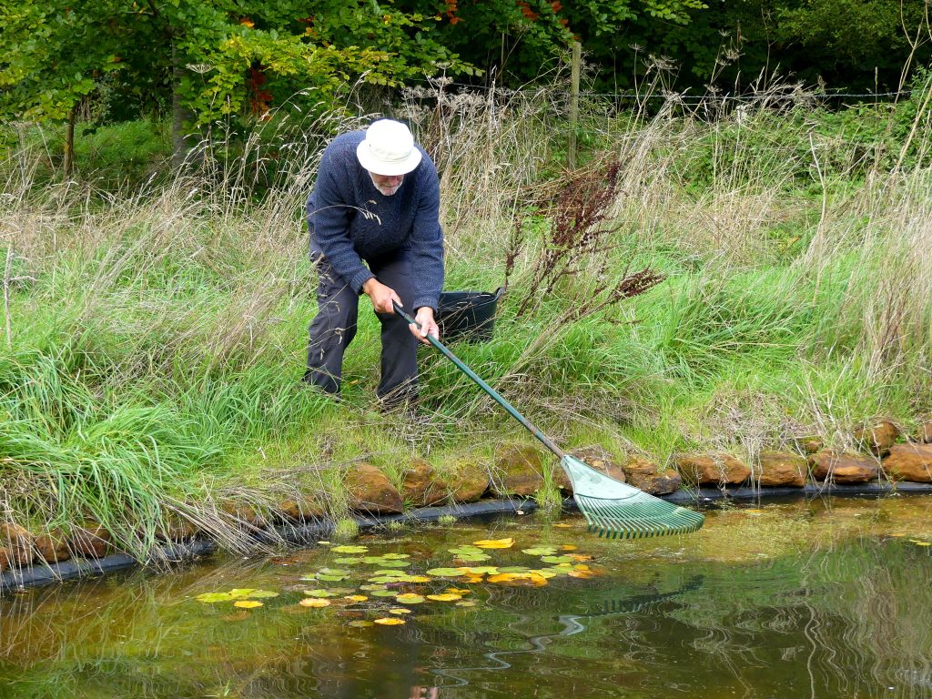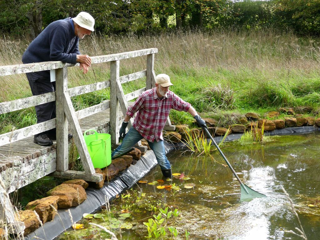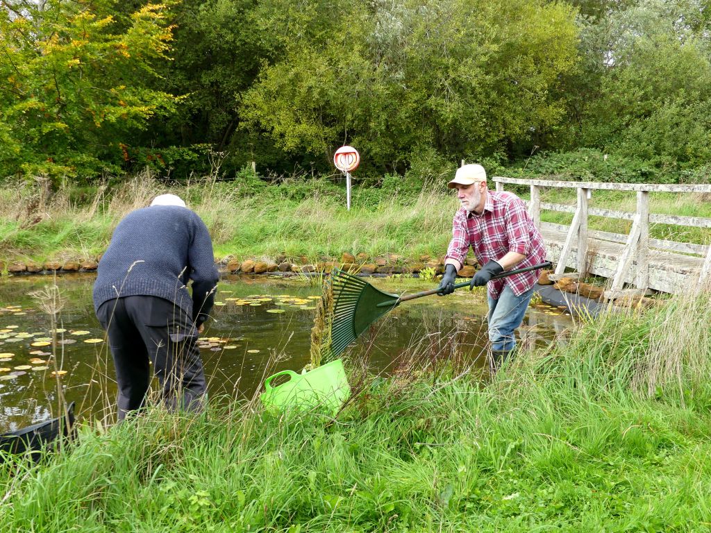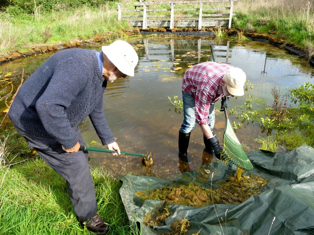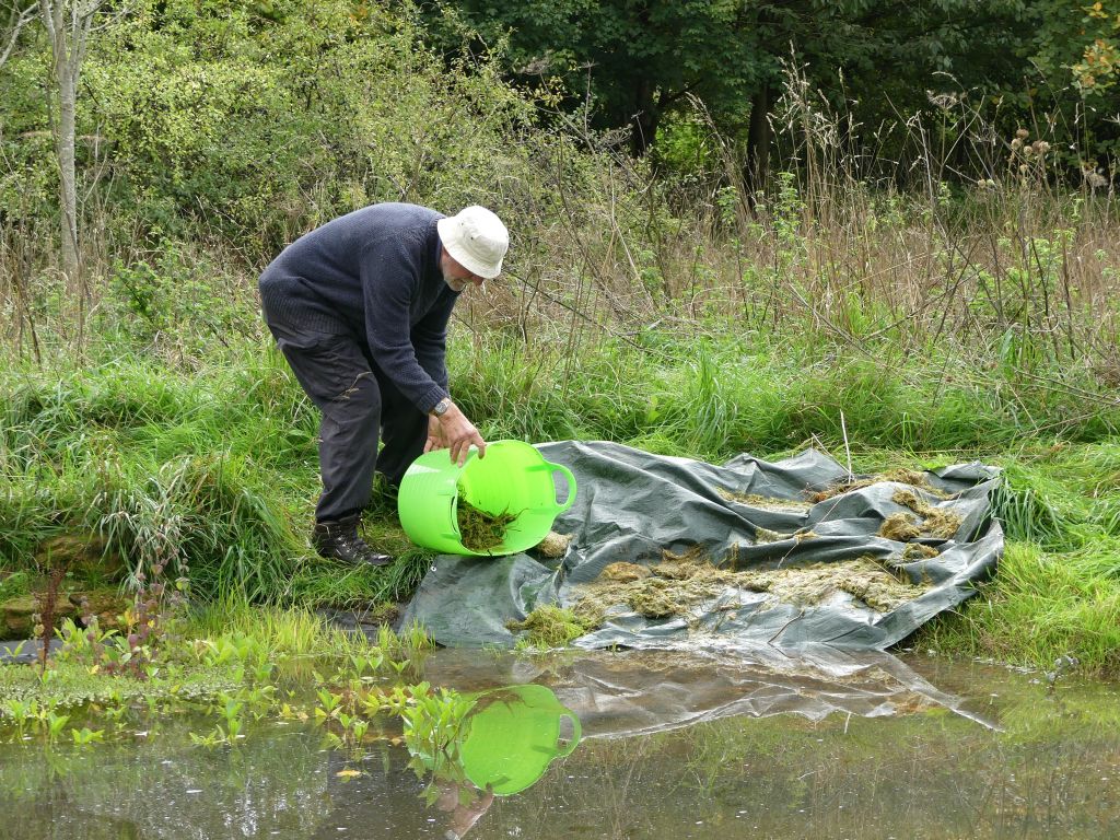 Volunteers used rakes and hoes to reach over the water and drag the unwanted floating weed to the edge. A tarpaulin was stretched out at the shallow and gently sloping end of the pond. The weed was gathered into buckets and spread on the tarpaulin. The water could drain out of the plants and creatures could crawl back to safety. Before the weed was taken to the compost heap, the strands of weed were pulled apart and minutely examined for small animals which were then removed and repatriated.