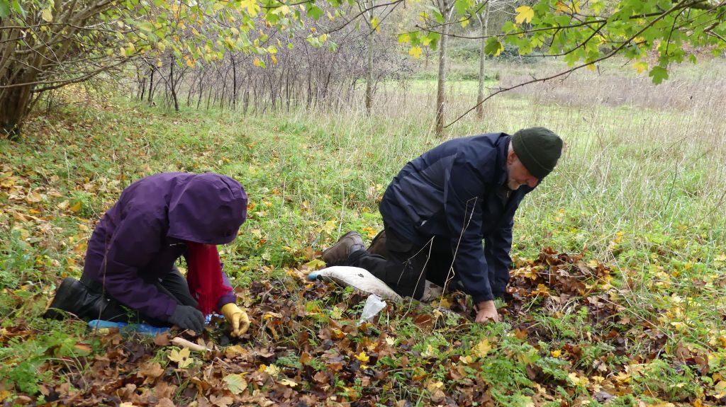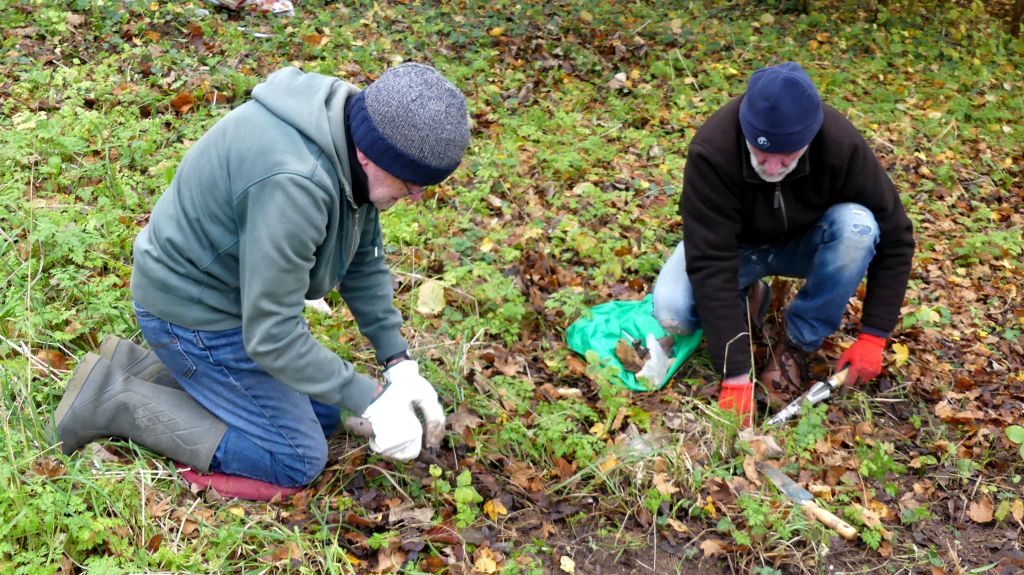 This Autumn we saw a “too good to miss” offer for native bluebell bulbs and decided to have another go at getting them to survive and colonise the Nature Area. Thanks to the efforts of the volunteers on 18 November we planted bulbs beneath a group of Field Maple trees and another batch beneath some Wild Cherry trees. They were planted 4 inches deep and 4 inches apart. I was interested to note that each person had their own favourite tool for the job and their own method of working. We are all wondering if these differences will affect the development of the bulbs more or less favourably, and a bit of friendly competition is being experienced to see which bulbs will best survive and flower in Spring 2026. We hope that grey squirrels do not dig up the bulbs.