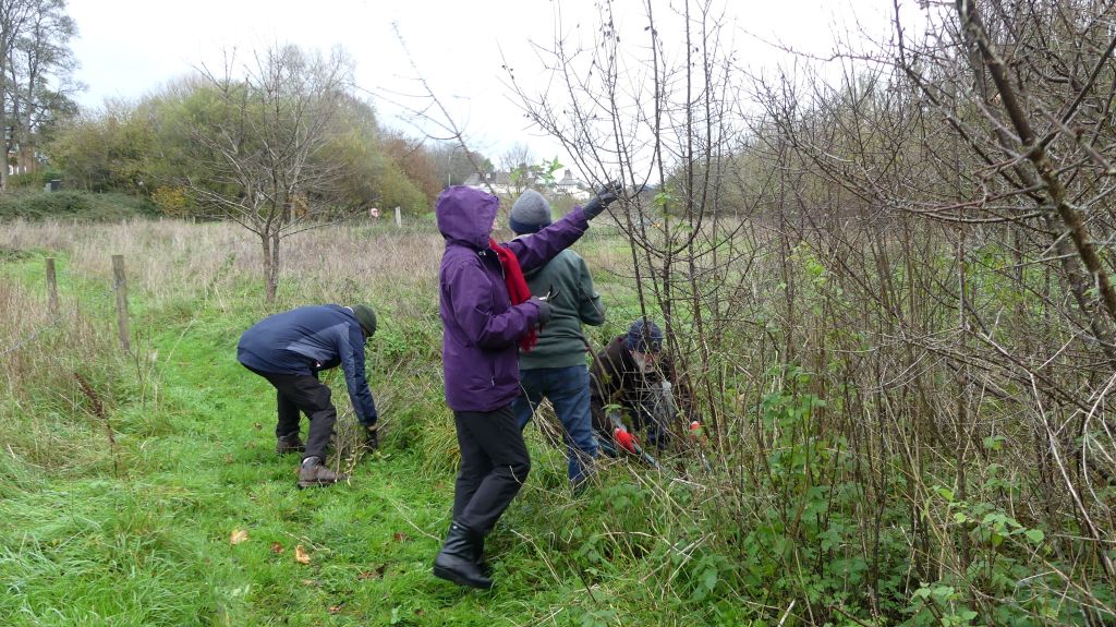 For the past two years we have used secateurs or tree loppers to cut the unwanted saplings down to the ground. This year we removed a slightly larger area of the thicket in the Scrub Zone at the far end of Nature Area. We want to develop more structural variety in that zone by planting a silver birch tree and some gorse bushes. We planted holly, guelder rose, and purging buckthorn last year. It would be good if the new plants thrived so that we would have more flowering and fruiting shrubs, some winter colour from the yellow gorse, and more shape and visual appeal year round. At present, apart from the blackthorn, the area flattens in winter as the dominating grasses, nettles, cow parsley and hogweed die back.